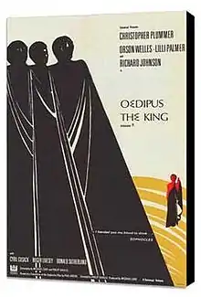 Oedipus the King is a 1967 film directed by Philip Saville based on the Athenian tragedy Oedipus Rex by Sophocles. The film boasts an all-star cast, including Christopher Plummer as Oedipus, Lilli Palmer as Jocasta, Orson Welles as Tiresias, Richard Johnson as Creon, Roger Livesey as the Shepherd and Donald Sutherland as the leading member of the Chorus.[1][2] Sutherland's voice, however, was dubbed by other actors, British actor Valentine Dyall and British actor Patrick Allen, though Allen's voice was uncredited.