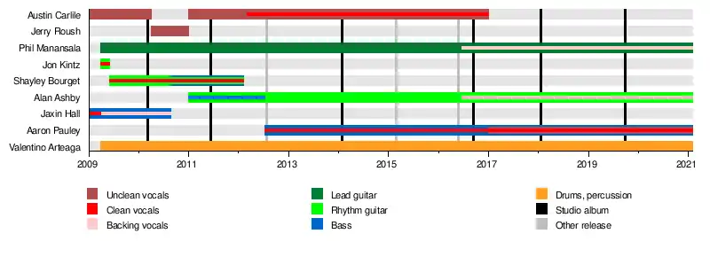 Of Mice & Men (often abbreviated OM&M) is an American rock band formed in Costa Mesa, California in 2009. The band's line-up currently consists of lead vocalist and bassist Aaron Pauley, guitarists Phil Manansala and Alan Ashby, and drummer Valentino Arteaga. The group was founded by former lead vocalist Austin Carlile and former bassist Jaxin Hall in mid-2009 after Carlile's departure from Attack Attack!. Carlile departed from the band in December 2016 citing that a long-term health condition prompted his exit. After Carlile's departure, the band continued to pursue creating music with Pauley as the band's bassist and lead vocalist.