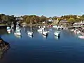 At what was then called Fish Cove, near the unnavigable Josias River, fishing was a major livelihood. But the cove was unprotected by a headland or breakwater from Atlantic storms, so fishermen had to protect their boats by hauling them ashore each night. Resolving to create a safe anchorage, they formed the Fish Cove Harbor Association, and dug a channel across land they purchased to connect Fish Cove with the Josias River. When the trench was complete, erosion helped to further widen the passage. The resulting tidewater basin is called Perkins Cove, spanned by a manually operated draw footbridge. With a three and a half-mile beach of pale sand and dunes forming a barrier peninsula, connected to the mainland in 1888 by bridge across the Ogunquit River, the village was discovered by artists. It became a popular art colony and tourist area. Particularly after 1898, when the Ogunquit Art Colony was established, it was not unusual to see both artists and fishermen working around Perkins Cove.[6] To accommodate summer crowds, several seaside hotels and inns were built. Marginal Way, a scenic trail, runs along the coast from Perkins Cove to Ogunquit Beach.[7] Ogunquit separated from Wells in 1980 and receives visitors from as far as Australia. Ogunquit was named America's Best Coastal Small Town in USA Today's 10 Best Readers' Choice 2016.[8]