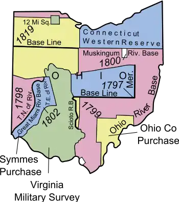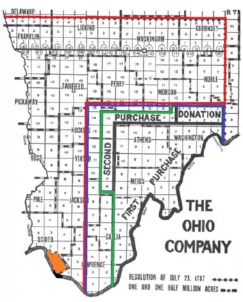 The company made its first installment of $500,000, but was unable to raise the second $500,000. It settled for a purchase of 750,000 acres (3,000 km2), plus the two townships for College Lands and the reserved School Lands and Ministerial Lands sections in each township, for a total area of 913,833 acres (3,698.15 km2), called the First Purchase.[10] The lands were privately surveyed, but on the same plan of townships, ranges, and sections as the adjacent Seven Ranges under the procedure of the Land Ordinance of 1785.[11][12]