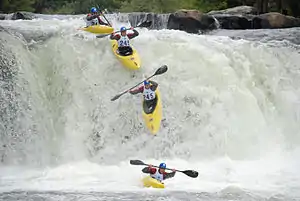 The Youghiogheny River is the busiest section of whitewater east of the Mississippi River. The Lower Yough, a 7-mile (11 km) run, begins at Ohiopyle Falls and ends at the Bruner Run take-out. The Middle Yough begins at the Ramcat put-in near Confluence and ends just above the falls in Ohiopyle. One weekend per year or so, there is a race and festival devoted to the falls, and the state park permits paddlers to run the falls. Only rubber rafts, closed-topped canoes and kayaks are permitted in the river. All visitors must wear life jackets certified by the United States Coast Guard. The Lower Yough River is rated Class III to Class IV on the International Scale of River Difficulty, depending on water conditions; the easier Middle Yough is rated II, and Ohiopyle Falls is rated IV. Boating must be in accordance with the Safety Code of American Whitewater. Inexperienced visitors are encouraged to hire one of the several private outfitters that offer guided trips down the rapids.[4]