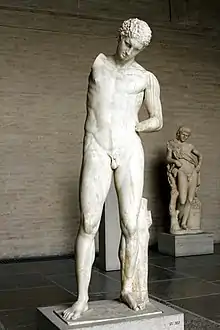 The athlete is represented pouring oil from a flask held high in his (missing) right hand into the (missing) palm of his left. The theme is represented on Attic vase-painting[6] and in freely reinterpreted cast terracotta miniatures.[7]
