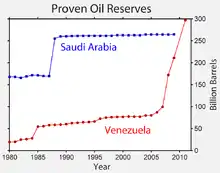 In early 2011, then-president Hugo Chávez and the Venezuelan government announced that the nation's oil reserves had surpassed that of the previous long-term world leader, Saudi Arabia.[17] OPEC said that Saudi Arabia's reserves stood at 265 billion barrels (4.21×1010 m3) in 2009.[19]