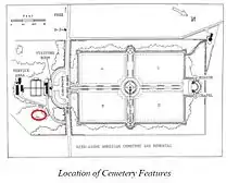Plot E is detached from the main four cemetery plots for the honored dead of World War I. It is located across the road and deliberately hidden from view, inside a 100×50 feet oval-shaped clearing surrounded by hedges and hidden in thick forest. Officially, Plot E does not exist: it is not mentioned on the ABMC website or in any guide pamphlets or maps. The plot is accessible only through the back door of the superintendent's office.[3] Access is difficult and visitors are not encouraged, though the section is maintained by cemetery caretakers who periodically mow the lawn area and trim the hedges. One cemetery employee described Plot E as a "house of shame" and a "perfect anti-memorial".[4]