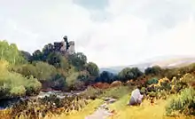 In the 18th century, the castle became a popular topic for painters interested in the then fashionable landscape styles of the Sublime and the Picturesque. Richard Wilson painted the castle in 1771, dramatically silhouetting the keep against the sky, producing what historian Jeremy Black describes as a "calm, entranching and melancholic" effect.[31] Thomas Walmesley's rendition went further, depicting Oakhampton Castle surrounded by an imaginary, Italianate lake in 1810.[32] Thomas Girtin painted the castle in 1797, as did his friend J. M. W. Turner in 1824.[33] Sir Vyell Vyvyan conducted some minor repairs to the castle during the 19th century.[34]
