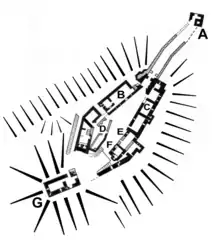 The barbican was built at the beginning of the 14th century and contained a guard-room on the first floor.[47] The barbican contains numerous putlog holes from its construction, although these would have been masked by exterior plasterwork in the medieval period.[48] A passageway led up from the barbican to the gatehouse, probably originally guarded by a drawbridge and containing the accommodation for the castle's constable.[49]