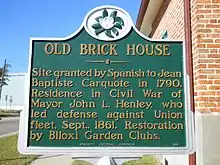 The Old Brick House, also known as Biloxi Garden Center, was built around 1850 as a modest family home by John Henley, a former sheriff and mayor of Biloxi. The house is situated on Back Bay in Biloxi, Mississippi. The home was added to the National Register of Historic Places in 1973,[2] and was designated a Mississippi Landmark in 1987. Although heavily damaged by Hurricane Katrina in 2005, the house was restored and re-dedicated in 2011.[3]