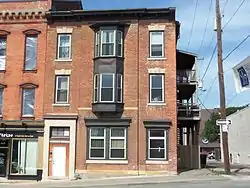 Designed by Davenport architect Willett Carroll, the building was built in 1857 as an engine house for a fire company.[3] That year the city council rejected sites along Washington Square and Court House Square for a new city hall, so in early 1858 the engine house's hall became the council chambers and other municipal offices were moved into other sections of the building. It continued to be used as a combination city hall and fire station until Hose Station No. 1 was built in 1877. A significant number of local industrialists and professionals served as mayor when this building housed city hall. They include George B. Sargent (1857), Ebeneezer Cook (1858–59), Hiram Price (1859), George H. French (1861-1862), John L. Davies (1865-1866), Michael Donahue (1867-1868), John C. Bills (1871, 1882, 1892), Ernest Claussen (1883-1889), and C. A. Ficke (1890-1891).[3] The current city hall was built in 1895 and five years later the city sold this building to John Ochs’ Sons realty. The building was converted around 1910 into a residential building containing six flats, and the structure was dramatically altered to its present appearance. It was renamed Oxford Flats and it reflected the trend of building apartment buildings on the edge of the downtown area.[2] While the structure is the oldest building in Davenport that is associated with municipal government and politics, it remains an apartment building.[3]