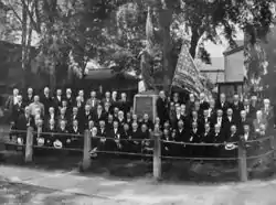 Four years later, in 1896, Sharpe's monument to his volunteers was added to the graveyard. The 16-foot (4.9 m) statue, the work of Byron M. Pickett, was dedicated in a ceremony attended by many of the 120th's former members.[9] It is the only Civil War monument erected to a unit's members by that unit's commander,[7] and one of the rare examples of such a war monument anywhere.[13] The plot it stands on was reportedly deeded to the monument itself.[9]
