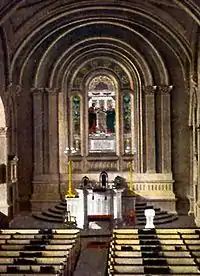 A raised wooden platform supports the pulpit, carved with some classical motifs such as rectangular, rounded lozenges and foliation, some of it gilded, echoing the wall behind it. It has two front piers that resemble antae. On the wall above the pulpit is a Palladian Tiffany stained glass window depicting the Presentation of Jesus at the Temple framed by gilded moldings and flanked by pairs of fluted Corinthian pilasters. Bronze statues of angels are on either side.[2]