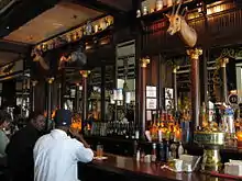 Old Ebbitt Grill was purchased on June 16, 1970, at a tax sale by Stuart C. Davidson and John Laytham, co-owners of the restaurant Clyde's of Georgetown.[68] Clyde's was founded in 1963 by Davidson, then an investment banker, after new legislation made it legal to serve liquor to patrons standing at bars. Since 1917, the liquor law had required that alcohol only be consumed while sitting at tables.[69] Davidson and Laytham bid in the tax sale hoping to buy beer steins and the mahogany bar, but ended up with the entire restaurant.[70] The IRS offered the entire restaurant for sale after an auction of individual items failed to raise more than $6,639. The sale price was $11,250.[71] Among the items they purchased were a 200-year-old clock which used carved wooden gears for its mechanism, a carved wooden grizzly bear once owned by Alexander Hamilton, crystal decanters dating to 1575, and stuffed boar's head, swordfish, alligator, and walrus head.[67][71][72]