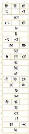 The script encodes three vowels, a, i, u, and twenty-two consonants, k, x, g, c, ç, j, t, θ, d, p, f, b, n, m, y, v, r, l, s, z, š, and h. Old Persian contains two sets of consonants: those whose shape depends on the following vowel and those whose shape is independent of the following vowel. The consonant symbols that depend on the following vowel act like the consonants in Devanagari. Vowel diacritics are added to these consonant symbols to change the inherent vowel or add length to the inherent vowel. However, the vowel symbols are usually still included so [di] would be written as [di] [i] even though [di] already implies the vowel.[29] For the consonants whose shape does not depend on the following vowels, the vowel signs must be used after the consonant symbol.[30]