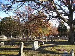 Old Pine Church is surrounded on three sides by a cemetery containing approximately 200 interments, the oldest section of which is located to the immediate east and south of the church building.[3] The earliest remaining gravestone dates from 1834, but several unmarked interment sites in the surrounding cemetery may date from as early as 1759.[3][22][26] The church's sign along U.S. Route 220 erroneously lists the date of the cemetery's oldest interment sites as 1792.[22]