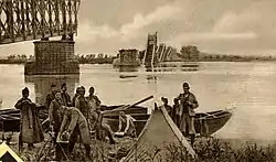When the World War I broke out on 28 July 1914, the bridge was the only connection between Serbia and the Austria-Hungary who already positioned its army near the bridge. On 29 July 1914, at 1:30 a.m., captain Mihailo Alić, with his platoon of pontoniers blew up the bridge. When the powerful explosion resounded, the entire city trembled. Three parts of the steel construction fell into the river. Cutting off the only link was instrumental in the defense of the city during the inaugural period of the war. Austro-Hungarians were now forced either to invade using boats or to try to secure a foothill on the Ada Ciganlija island, which they attempted during the Battles of Ada Ciganlija.[8][9] The Hungarian ship "Alkotmány" was beneath the bridge when it collapsed.[7]