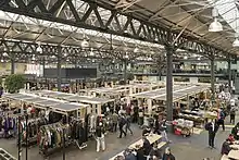 Old Spitalfields Market is a covered market in Spitalfields, London. There has been a market on the site for over 350 years. In 1991 it gave its name to New Spitalfields Market in Leyton, where fruit and vegetables are now traded. In 2005, a regeneration programme resulted in the new public spaces: Bishops Square and Crispin Place, which are now part of the modern Spitalfields Market. A range of public markets runs daily, with independent local stores and restaurants - as well as new office developments.[1]