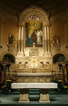 The church was designed by Victor Schulte, a Prussian immigrant from Westphalia.[3] Schulte designed the church in Zopfstil style, a German counterpart of the American Federal style,[4] which was probably familiar to German immigrants in the parish. Hallmarks of the style are the low-pitched roof, the round-topped windows, and a neat simplicity that contrasted with Baroque and Rococo styles.[5] Schulte also designed Milwaukee's St. John Cathedral (built 1847-53) and the 1850 Holy Trinity Catholic Church in the same style.[2] The cornerstone was laid on April 19, 1846.[6] The building is constructed of cream city brick. The carved wooden main altar was purchased in 1848. A painting of the Annunciation behind the altar by Franz Xavier Glink was donated by King Ludwig I of Bavaria.[5]