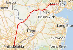 Old York Road began at Coryell's Ferry, which was on Emanuel Coryell's property between Church Street and Swan Creek (for which Swan Street is named) in Lambertville. Although this was not the first ferry operated from the New Jersey side, Coryell purchased land here and began operating a ferry service in 1732.[6] The village on the New Jersey side began to be known as Coryell's Ferry. The original route followed Main Street to York Street and briefly joined up with NJ 179, the modern Old York Road.