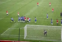Solskjær's opportunities were limited at the start of the 2000–01 season, however he scored on his second start of the season on 16 September 2000 as United beat Everton 3–1.[86] On 31 October, he netted a brace during a 3–0 victory against Watford in the League Cup third round, scoring in the 12th and 81st minutes.[87] He scored another brace on 23 December, against Ipswich Town in a 2–0 victory.[88] Three days later, Solskjær helped United snatch a 1–0 win against Aston Villa, with the Norwegian heading in a David Beckham cross in the 85th minute.[89] Solskjær scored the first goal of United's 2–1 FA Cup third round win over Fulham on 7 January 2001.[90] On 25 February, he netted Manchester United's fifth goal against Arsenal (their closest title rivals) in United's 6–1 demolition,[91] which sent them 16 points clear at the top of the table.[92] On 10 April, he scored the winning goal in United's 2–1 victory over Charlton Athletic, scoring only six minutes after coming on in the 76th minute.[93] Manchester United wrapped up the Premier League title in April – their third consecutive title, and Solskjær's fourth.[94][66] That season Solskjær scored 10 league goals in 31 appearances (19 starts).[95]
