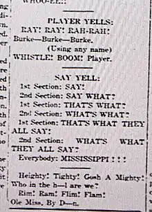 The cheer first appeared in print on November 19, 1926 in the student newspaper The Mississippian, now known as The Daily Mississippian. The Hotty Toddy was printed along with all of the popular sports cheers used by the students at the time. However, the lyrics were slightly different than the version used today. The original cheer was printed:[31]