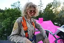 In April 2016, they draped the facade of Virginia MOCA with a giant crocheted New York Times front page, dated 2020 and featuring ecologically themed good news stories.[52] Also in 2016, they created an installation at Verket, a museum in Avesta, Sweden, and was aided by Syrian and Ukrainian women refugees; after hearing their stories, they were inspired to cover a house in Avesta and another in Kerava, Finland, entirely with pink crochet to illustrate the power of women.[53][54] While working in Avesta, the refugee women described their stories of how they'd lost everything during the war. This motivated Olek to create a short film, "In the Blink of an Eye," where they exploded a crocheted house inside the Verket Museum.[55] On 3 November 2016, a pink blanket crocheted by Olek and thirty-eight volunteers, featuring Hillary Clinton's face and the hashtag #ImWithHer in black and white, was nailed to a billboard in New Jersey.[56] In December 2016, Olek exhibited the piece entitled, "You Can't Fool All The People," at MANA Wynwood in Miami.[57]
