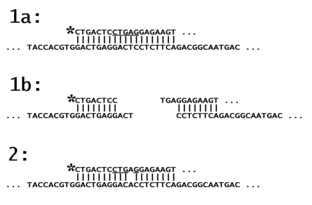 In part 1a of the schematic the oligonucleotide probe, labeled on its left end (asterisk), is shown on the top line. It is fully complementary to its target DNA (here taken from the human β-hemoglobin gene), as shown on the next line. Part of the probe includes the Recognition site for the restriction enzyme Dde I (underlined).