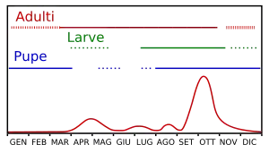The population size varies throughout the year, but with two peaks: the first in the middle of spring, at the development of the winter generation of adults, and the second, more intense, in early autumn when the olives are at the highest degree of receptivity, the temperatures drop slightly and the climate becomes wetter. In Sardinia, the larval population peaks typically occur during the months of April–May and September–October.
