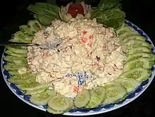 Olivier salad (Russian: салат Оливье, tr. salat Olivye)[Note 1] is a traditional salad dish in Russian cuisine, which is also popular in other post-Soviet countries, many European countries, Turkey, Iran, Israel, Mongolia and also throughout Latin America. In different modern recipes, it is usually made with diced boiled potatoes, carrots, brined dill pickles (or cucumber), green peas, eggs, celeriac, onions, diced boiled chicken or bologna sausage (sometimes ham or hot dogs), and tart apples, with salt, pepper, and mustard added to enhance flavor, dressed with mayonnaise. In many countries, the dish is commonly referred to as Russian salad. A variation called Stolichny salad (Russian: салат "Столичный", "capital city salad") exists, and is also popular in the Russian cuisine.