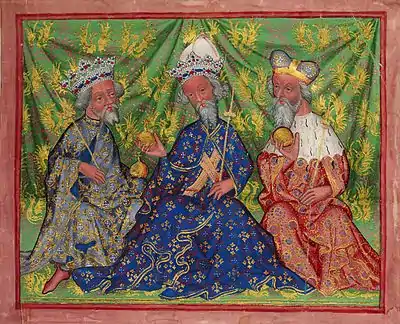 The Emperor Charles IV (centre), surrounded by his sons: King Wenceslaus IV of Bohemia (left) and Margrave Jobst of Moravia (right). They are all shown with the symbols of rule and their characterist beards. Charles wears a closed crown, Wenceslaus an open one and Jobst a margravial hat.[1]