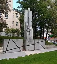 Nazi Germany co-formed the Einsatzgruppe V in the city, which then entered several Polish cities and towns, including Grudziądz, Mława, Ciechanów, Łomża and Siedlce, to commit various atrocities against Poles during the German invasion of Poland that began World War II in 1939.[32] German troops invaded Poland also from Olsztyn.[3] After the German invasion of Poland, local Poles were also subjected to mass executions[10] and deportations to occupied Poland. Arrested Poles were held in a local prison and then forced to remove Polish signs and inscriptions in the city, while the German population gathered and insulted them.[33] The Gazeta Olsztyńska was abolished by the German authorities, the newspaper's headquarters was demolished and the editor-in-chief Seweryn Pieniężny was arrested and executed in the KZ Hohenbruch[14][3] along with co-publisher Wojciech Gałęziewski and the "Rolnik" Cooperative chief Leon Włodarczyk, while Pieniężny's wife was deported to the Ravensbrück concentration camp.[34] The last pre-war Polish consul in Allenstein, Bohdan Jałowiecki, along with the consulate staff, was imprisoned in the Hohenbruch and Soldau concentration camps,[35] and then murdered.[36] Polish teachers were deported to the Dachau concentration camp.[34]