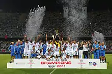 In the Champions League, Marseille became the first French team to win at Anfield when they beat 2007 runners-up Liverpool 1–0, and the team took six out of six points from their opening two games. They only drew one more match, and in a winner-takes-all final group game they lost 4–0 to Liverpool, who became the first English team to win at the Stade Vélodrome. Marseille, coming third in the Champions League Group A, then joined the UEFA Cup.[14] Marseille finished the 2008–09 season with a second-place finish in Ligue 1, following a tight race with Bordeaux for the title. This earned them direct entry into the group stages of the UEFA Champions League, their third consecutive season in the competition. Marseille won the 2010 Coupe de la Ligue Final beating Bordeaux 3–1 at the Stade de France in March 2010. This was their first major title since their Champions League triumph 17 years earlier. Two months later, Marseille won their first league championship for 18 years with two games to spare after beating Rennes 3–1.[15][16] Marseille defeated PSG on penalties to win the 2010 Trophée des Champions at Stade 7 Novembre in Rades, Tunisia, before the season began. Marseille then became the first team to win back-to-back Coupe de la Ligue successes when they won the 2011 edition by beating Montpellier 1–0 on 23 April. Before that, they qualified for the last 16 of the UEFA Champions League for the first time since their historic success, but lost 2–1 at Old Trafford to Manchester United and also set a Champions League record by thrashing Žilina 7–0 in what was the biggest away win in the competition's history. In 2011, Marseille lost the Ligue 1 championship title but qualified for the UEFA Champions League for the fifth time in a row, a club record. On 27 July 2011, Marseille won the 2011 Trophée des Champions title by beating Lille 5–4 at Stade de Tanger in Morocco. The result was significant as OM were 3–1 down with five minutes to go, only to embark on a remarkable comeback which saw 5 goals scored in the last five minutes with André Ayew scoring a hat-trick.