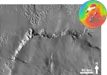 Olympus Mons is asymmetrical structurally as well as topographically. The longer, more shallow northwestern flank displays extensional features, such as large slumps and normal faults. In contrast, the volcano's steeper southeastern side has features indicating compression, including step-like terraces in the volcano's mid-flank region (interpreted as thrust faults[32]) and a number of wrinkle ridges located at the basal escarpment.[33] Why opposite sides of the mountain should show different styles of deformation may lie in how large shield volcanoes grow laterally and in how variations within the volcanic substrate have affected the mountain's final shape.