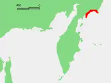 The Olyutorsky Bay (Russian: Олюторский залив) is a gulf or bay of the Bering Sea in the northern part of Kamchatka Krai, Russia. It is bounded on the west by the Govena Peninsula which separates it from Korfa Bay and on the east by the Olyutorsky Peninsula. It extends roughly 83 km inland and is 228 km at its widest. The deepest spot is about 1,000 meters. The western shore is dominated by the Pylginsky Ridge, which has a maximum elevation of 1,357 meters. The bay is normally covered by fast ice from December to May. It has a large tidal range of up to 1.9 meters.