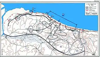 While the coastal defenses had not turned back the invasion at the beach, they had broken up and weakened the assault formations struggling through them. The German emphasis on this Main Line of Resistance (MLR) meant that defenses further inland were significantly weaker, and based on small pockets of prepared positions smaller than company sized in strength. This tactic was enough to disrupt American advances inland, making it difficult even to reach the assembly areas, let alone achieve their D-Day objectives.[80] As an example of the effectiveness of German defenses despite weakness in numbers, the 5th Ranger battalion was halted in its advance inland by a single machine gun position hidden in a hedgerow. One platoon attempted to outflank the position, only to run into another machine gun position to the left of the first. A second platoon dispatched to take this new position ran into a third, and attempts to deal with this met with fire from a fourth position. The success of the MLR in blocking the movement of heavy weapons off the beach meant that, after four hours, the Rangers were forced to give up on attempts to move them any further inland.[81]