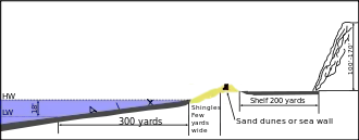 Omaha was bounded at either end by large rocky cliffs. The crescent-shaped beach presented a gently sloping tidal area averaging 300 m (330 yd) between low and high-water marks. Above the tide line was a bank of shingle 2.5 m (8 ft) high and up to 15 m (49 ft) wide in places. At the western end, the shingle bank rested against a stone (further east becoming wood) sea wall which ranged from 1.5–4 m (5–13 ft) in height. For the remaining two thirds of the beach after the seawall ended, the shingle lay against a low sand embankment. Behind the sand embankment and sea wall was a level shelf of sand, narrow at either end and extending up to 200 m (220 yd) inland in the center, and behind that rose steep escarpments or bluffs 30–50 m (33–55 yd) high, which dominated the whole beach and were cut into by small wooded valleys or draws at five points along the beach, codenamed west to east D-1, D-3, E-1, E-3 and F-1.[4]