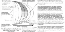 The Omega Point is a supposed future when everything in the universe spirals toward a final point of unification.[1] The term was coined by the French Jesuit Catholic priest Pierre Teilhard de Chardin (1881–1955).[2] Teilhard argued that the Omega Point resembles the Christian Logos, namely Christ, who draws all things into himself, who in the words of the Nicene Creed, is "God from God", "Light from Light", "True God from true God", and "through him all things were made".[3] In the Book of Revelation, Christ describes himself thrice as "the Alpha and the Omega, the beginning and the end". The idea of the Omega Point is developed in later writings, such as those of John David Garcia (1971), Paolo Soleri (1981), Frank Tipler (1994), and David Deutsch (1997).[4][5][6]