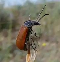 Omophlus lepturoides can reach a body length of 11–16 millimetres (0.43–0.63 in).[2] Head anh pronotum are black and rather hairy. Elytra are reddish-brown. Legs are black.