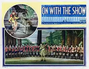On with the Show! is a 1929 American Pre-Code musical film released by Warner Bros. Filmed in Two-strip Technicolor, the film is noted as the first all-talking, all-color feature length film, and the second color film released by Warner Bros.; the first was the partly color, black-and-white musical The Desert Song (1929).[5][6]