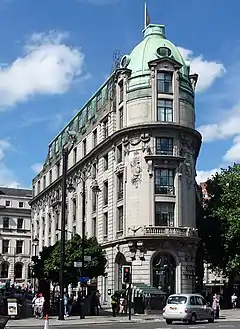 The building is noteworthy for being an early example of steel-framed construction in London,[2] and is clad in grey Norwegian granite with a slate and copper roof, in an architectural blend of the Louis XVI and Louis XV styles, which was a specialty of Mewès and Davis' firm.[3] Until 1937 the building was the headquarters of the Morning Post newspaper, from 1928 it housed the offices of both the Morning Post and the Illustrated London News. In 1928 two additional floors were added in the mansard roof, incorporating steep dormer windows.[3]