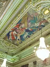 This elegant and historical building has been described as a "monumental neo-classical design" and a "modern rendering of the late Renaissance". The exterior, foyer and staircase are made of Portland stone and many of the rooms are ornately decorated with French walnut and oak panelling, carved plaster ceilings and elaborate crystal chandeliers. The most impressive apartment in the building is the Great Hall, which is approached via the grand staircase and its processional route to the first floor. The walls of the Great Hall can be described as a 'Graeco-Roman rhapsody', as huge marble pilasters with bronze effect Ionic capitals and metal bases interspersed with consoled panels that frame portraits from the Institution's oil paintings collection flow around the vertical surfaces. The ceiling of the Great Hall features a huge painting by Charles Sims commemorating World War 1 (the patron being Sir John Purser Griffith, ICE President in 1920). The work shows a female figure draped in what appears to be a robe or peplos holding in one hand a giant Union Flag, billowing in the wind, and in the other hand a wreath (she is identified in the ICE Catalogue of Works and Art as 'the figure of Renown, wearing a mourning veil and holding out a wreath of bays with the gesture of crowning'). Peering down at the viewer from the edge of the painting are servicemen and women dressed in uniforms reflecting the different branches of the military and above them can be seen a low-flying biplane with fixed undercarriage proudly displaying its red, white, and blue insignia. The corners of the painting show civil engineering scenes in the form of viaducts, steel structures, cranes etc.