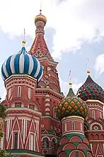 Some scholars postulate that the Russians borrowed onion domes from Muslim countries, possibly from the Khanate of Kazan, whose conquest in 1552 Ivan the Terrible commemorated by erecting St. Basil's Cathedral.[3] Eight of the nine domes featured on St. Basil's Cathedral represent each attack on Kazan. The ninth dome was constructed 36 years after the siege of Kazan as a tomb for Ivan. The ornate finishes of these domes are bright in color and bold in shape as they are adorned with pyramids and stripes, and many other patterns seen on other cathedrals than Basil's.[4] Some scholars believe that onion domes first appeared in Russian wooden architecture above tent-like churches. According to this theory, onion domes were strictly utilitarian, as they prevented snow from piling on the roof.[5]