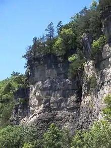 The Vilander Bluff Natural Area is a unit of the state park that is located at 38°05′56″N 91°08′20″W, 7 miles (11 km) northeast of the main body of the park. Its eponymous cliffs harbor unique natural communities, most notably a dry dolomite cliff community with over 200 ancient red cedar trees (Juniperus virginiana) that range in age from 200 to 500 years. The unit straddles the Meramec River, and opposite the bluffs is a rookery containing over 40 nests of the great blue heron.[8]