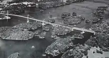 The Thousand Islands Bridge system was opened in a ceremony on August 18, 1938 by Canadian prime minister William Mackenzie King and American president Franklin D. Roosevelt. Also in attendance was Albert Matthews, lieutenant governor of Ontario, representing the King in Right of Ontario.[7] The new bridge approach included an interchange with the St. Lawrence River Road, known today as the Thousand Islands Parkway, but it was not numbered. Until 1965, the route was known as the Ivy Lea Bridge Approach. Highway 137 was first designated in 1965 as far as the Thousand Islands Parkway.[2] It was extended to the newly opened Highway 401 in 1968.[8] The route has remained unchanged in the years since then.[3]