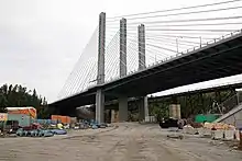 The Queensway was constructed in four phases, each opening independently: phase one, from Alta Vista Drive (now Riverside Drive) east to Highway 17 (Montreal Road); phase two, from Highway 7 and Highway 15 (Richmond Road) to Carling Avenue; phase three, from Carling Avenue to O'Connor Street; and, phase four, from O'Connor Street to Alta Vista Drive, crossing the Rideau Canal and Rideau River.[30] Phase one opened to traffic on November 25, 1960, extending up to the Rideau River.[31] On the western side of Ottawa, phase two opened a year later in October 1961. The central section presented the greatest challenge, as an embankment was built to create grade-separations. In addition, the structures over the Rideau Canal and river required several years of construction. On May 15, 1964, the majority of the third phase was ceremonially opened.[32] completing the Carling Avenue interchange and extending the freeway as far as Bronson Avenue.[33] Several months later, on September 17 the short but complicated section east to O'Connor Street was opened.[32] This left only phase four, the central section of the Queensway, which was opened in three segments. On November 26, 1965, the structures over the Rideau Canal were opened to traffic. At the same time, the westbound lanes of the Queensway were extended to Concord Street, located west of the Nicholas Street interchange.[34] The interchange opened on January 1, 1966, allowing travel in both directions over the canal.[35] The final segment, linking the two section of the Queensway, was placed into service on October 28, 1966.[36] Following this, the Highway 17 designation was applied along the Queensway and the old routing renumbered as Highway 17B.[37]