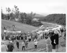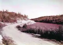 From the east, construction proceeded at a similar pace, although through much more barren expanses of forests and lakes. By the end of 1932, construction had proceeded from Thunder Bay through Upsala to English River. A 75 mi (121 km) gap was all that remained, between Dyment and English River.[11] On June 4, 1934, crews cleared the last section of forest separating Thunder Bay from Winnipeg.[15] However, it would require another year of rock blasting and construction to make the route navigable by vehicles. On July 1, 1935, a multi-day motorcade celebration was held to officially open the new highway. A convoy of vehicles travelled from Thunder Bay to Winnipeg along the route, resting overnight in Kenora before completing the two-day journey.[16][17]
