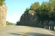 Amongst some of the most difficult terrain encountered in Canada, engineers blasted 2,087,234 cubic metres (2,730,000 cubic yards) of rock, removed 5,982,641 cubic metres (7,825,000 cubic yards) of earth, and cleared 6.97 square kilometres (1,720 acres) of forest in order to bridge the 266 kilometres (165 mi) of wilderness known as "the Gap".[23] The Gap was completed and opened to traffic on September 17, 1960, uniting the two segments and completing the route of Highway 17 from the Manitoba border to the Quebec border.