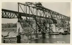 Before the outbreak of World War II in 1939, a new bridge spanning the Nipigon River was completed alongside a 91.6 km (56.9 mi) highway eastward to Schreiber. Both were opened together ceremoniously on September 24, 1937.[21] When the war began, construction on Highway 17 halted,[9] with effort instead focused on the simpler northern route via Geraldton and Hearst.[22]