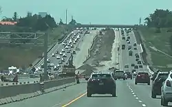 Highway 400, along with Highway 401 and Highway 402, was one of the first modern freeways in Ontario. Planning for the Toronto–Barrie Highway, which would become Highway 400, began in 1944.[1] The two routes connecting Barrie with Toronto at the time, Highway 11 and Highway 27, were becoming congested. Grading on a new alignment between Weston Road and Jane Street was completed from Wilson Avenue to Highway 27 (Essa Road) by 1947.[3] The onset of the Korean War slowed construction on the highway considerably,[13] and it wasn't until December 1, 1951 that two lanes (one in each direction) would be opened to traffic. All four lanes were opened to traffic on July 1, 1952, at which point the highway was designated Highway 400.[14] The name was the scorn of one newspaper editor, who published his distaste for using numbers to name a highway.[15] The freeway featured a 9.1 m (30 ft) grass median.[16]