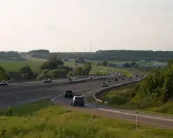 From Highway 401 to the Holland Marsh the freeway largely parallels the arterial/concession roads Weston Road and Jane Street, passing over the height of land at the Oak Ridges Moraine.[9] The highway passes through protected rural areas in northern York Region and encounters rolling countryside in Simcoe County south of Barrie.[8] The section near Barrie is subject to snowsqualls as it lies near the edge of Georgian Bay's snowbelt.