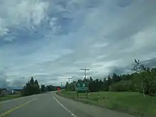 Crossing the American border, the Pigeon River Bridge is 480 kilometres (300 mi) west of the Sault Ste. Marie International Bridge and 480 kilometres (300 mi) east of the Fort Frances-International Falls International Bridge, and is near a visitor center.[3] Highway 61 begins at the Ontario-Minnesota border at the Pigeon River; the road continues south to Duluth as State Highway 61 on the American side. Proceeding north from the border, the route passes the customs station and curves to the north. Passing its former routing along Highway 593, the highway curves eastward to avoid mountains.[4] It zig-zags around a range of mountains, eventually turning northward and passing to the west of Cloud Bay. The highway continues north for 20 kilometres (10 mi) through Neebing, running between mountain ranges on either side. It rises at Moose Hill, meets Highway 608 and enters one of the few agricultural areas in northwestern Ontario. Shortly thereafter, Highway 61 curves to the east, passing the southern terminus of Highway 130 along the way.[4] It then enters the outskirts of Thunder Bay.[5]