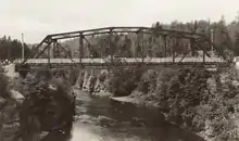 In response, the Rotary Clubs of Port Arthur and Duluth met to discuss a solution. As an international crossing, any bridge over the river would require federal approval from both governments. Both sides agreed that the approval process would be too slow, and decided to construct the bridge regardless. "The Outlaw" bridge was opened by a travelling motorcade on August 18, 1917, finally permitting travel between Ontario and Minnesota.[10] To the surprise of the Rotary Clubs, J. E. Whitson, Roads Commissioner of Northern Ontario, and Howard Ferguson, Minister of Lands, Forest and Mines, were present at the opening, and agreed to pay the $768,000 ($13 million in 2018[11]) bridge cost.[8] The bridge and the Canadian road approaching it fell under the jurisdiction of the Department of Highways (now the Ministry of Transportation) on April 1, 1937, and the Scott Highway became Highway 61 on October 6.[2] The Outlaw was rebuilt as a steel truss structure in 1934 following several accidents.[8]